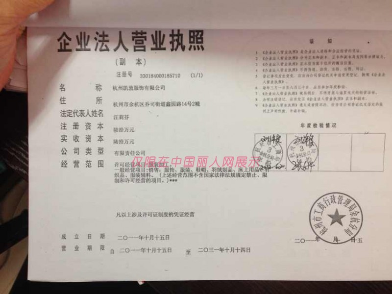 凯敦服饰/杭州凯敦服饰有限公司/营业执照