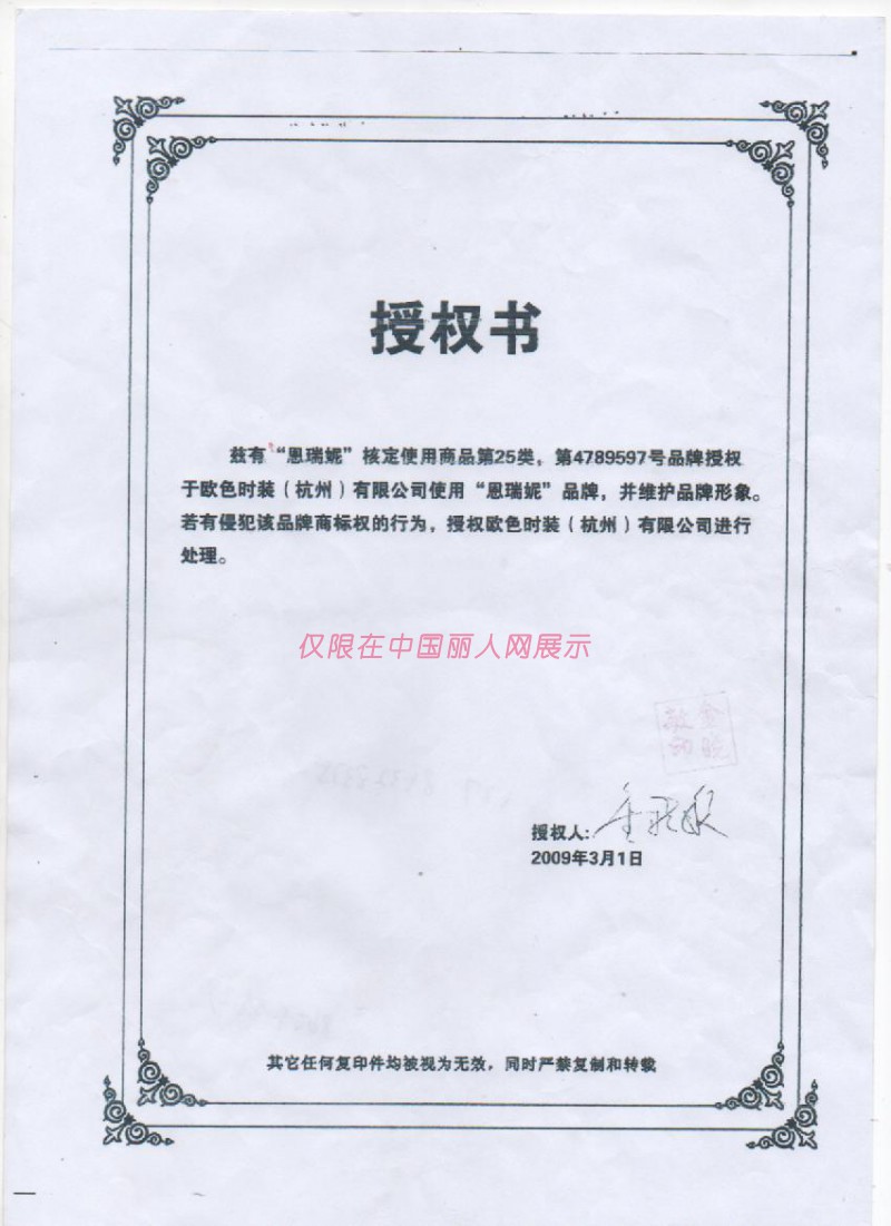 恩瑞妮品牌证书