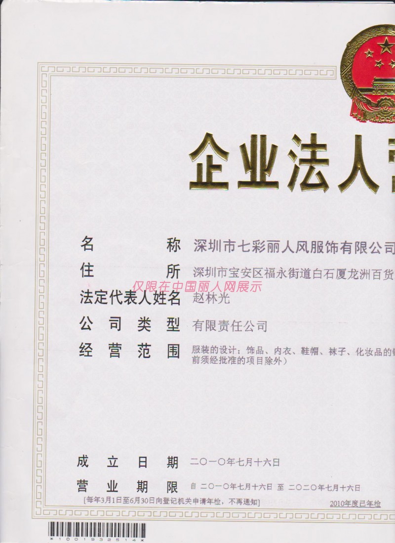 七彩丽人风/深圳市七彩丽人风服饰有限公司/营业执照
