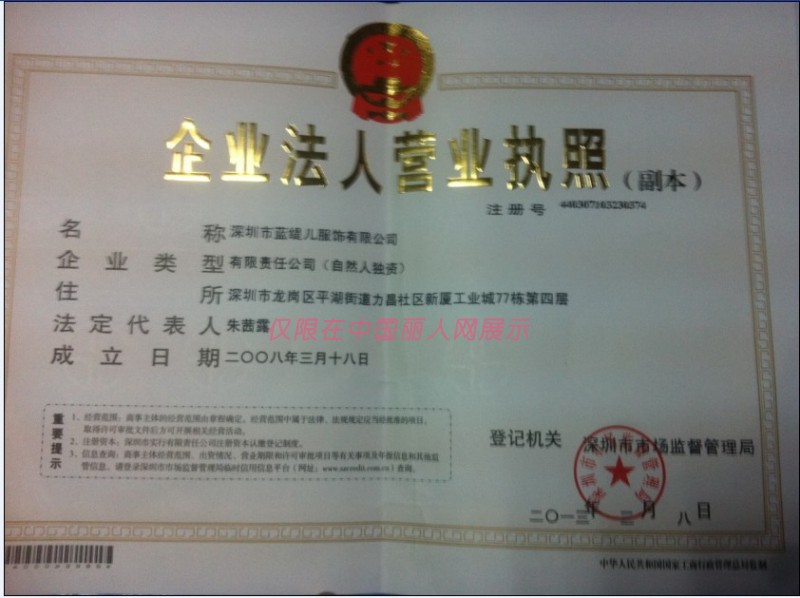 蓝缇儿服饰/深圳市蓝缇儿服饰有限公司/营业执照