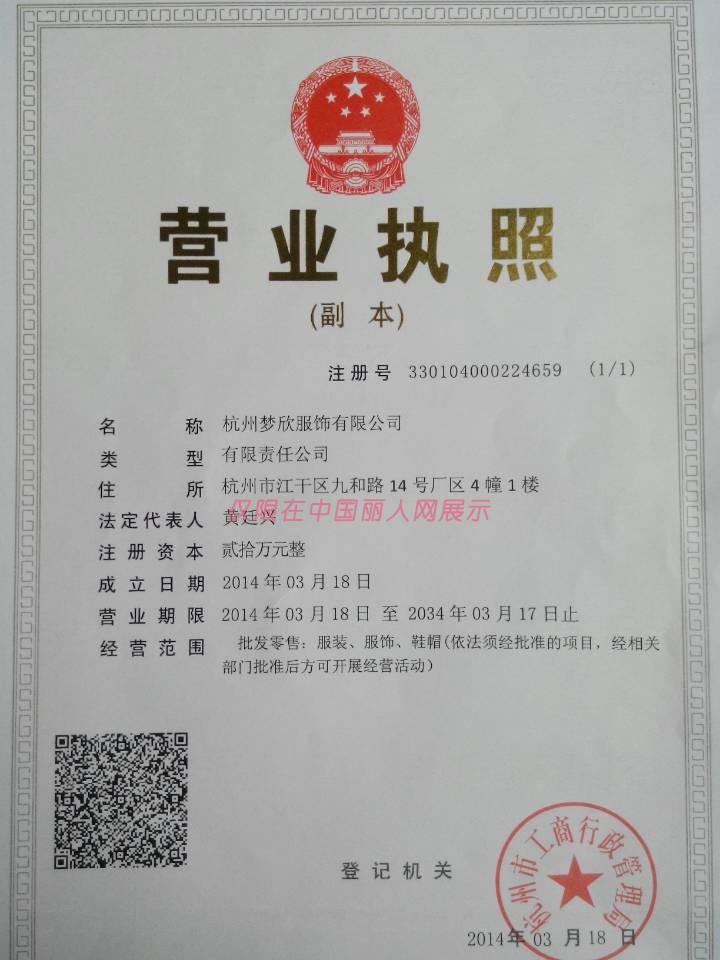 梦欣服饰/杭州梦欣服饰有限公司/营业执照