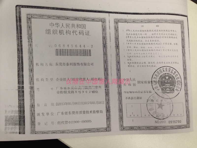 泰利/泰利(国际)服饰有限公司/荣誉证书