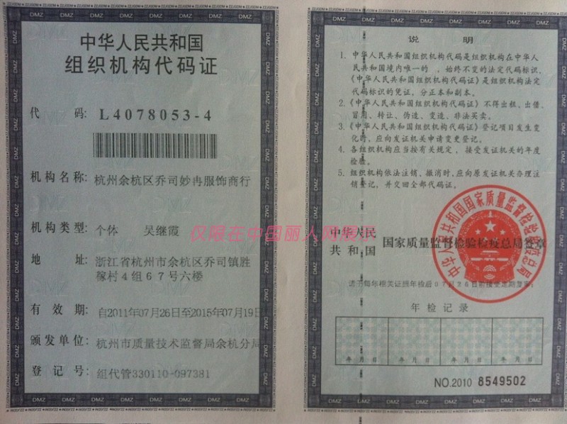 妙冉服饰/杭州余杭区乔司妙冉服饰商行/营业执照