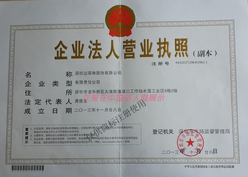 迈菲琳服饰/深圳市迈菲琳服饰有限公司/营业执照