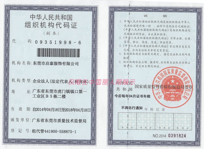 启泰服饰/东莞市启泰服饰有限公司/营业执照