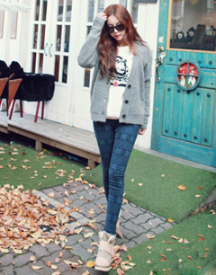 浅灰色针织开衫外套,毛绒绒的质感,简约秀气的风格,穿在身上甜美活泼。搭配白色T恤,下穿紧身裤和高帮球鞋,非常显腿长。青春亮丽的视觉感受,穿出与众不同的青春甜美时尚气息。