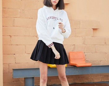 简单的白色字母卫衣,是衣柜里面的基础款,非常的百搭,连帽设计休闲时尚,红色字母图案简约时尚,袖口处的红线设计更加亮眼。这件白色卫衣搭配黑色百褶裙甜美可爱,更加具有青春活力,如果不想穿裙装,搭配休闲裤也十分的合适呢!