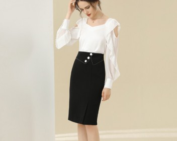 简单中透露出精致优雅,是韩式穿搭的精髓,白色上衣搭配黑色半裙是非常常见的穿搭,但是上衣采用优雅的方领设计更加别致,同时袖子出精致的镂空设计和百褶花边,更加具有女人味,精致优雅,搭配简单的黑色半裙,虽然配色简单,但是一点都不会觉得单调。