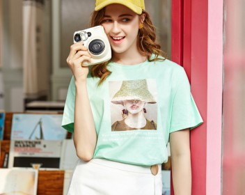 绿色的T恤青春靓丽,时尚个性的印花图案,非常具有活力,搭配白色半裙,整体的配色都是比较清爽的,半身裙的开叉设计更加具有女人味,将T恤扎进裙子中,可以更好的拉高身材比例,活力满满的穿搭更适合在春天穿。