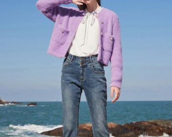 生机勃勃的春天就应该穿一些鲜亮的眼神,这件紫色的针织外套,就非常的亮眼,细腻柔和的面料是,穿着舒适自在,同时不失温婉的女性魅力。搭配白色衬衫和复古牛仔裤,简单大方也足够精致,短款更能展现高挑的身材。