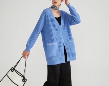 过了隆冬,在春天穿一些清爽的颜色会更加舒适,这件天蓝色的长款针织衫,慵懒随意,搭配一条黑色休闲裤,非常日常的穿搭,也能体现出你的时尚个性。短款的天蓝色针织衫更加具有活力,搭配白色裤子更加青春靓丽,简单中却不失个性。