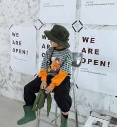 小孩子也需要穿的潮帅,通过的叠穿的方式,让孩子看着不一般。像最简单的,T恤内在叠加一件长袖,十分的chic的穿法。绿色条纹的T恤,充满着个性,内衬选择一件明亮的橘色长袖,来突出层次感。下身搭配一时间黑色的长裤,简简单单超级好看。