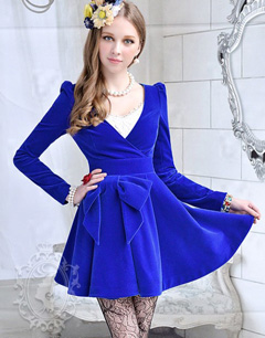 明度超高的宝蓝色打造华丽感,天鹅绒面料光泽增添高品质的质感。大气的V领满足搭配的层次,腰际精美的蝴蝶结绝对是亮点,收腰大摆版型是优化身形的有利法宝,上身效果高贵而不失甜美气质。