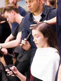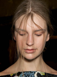 塑料波浪,模拟人体模特设计,由发型师Luke Hersheson打造。他用亮泽喷雾和润发啫喱混合后用细密的发梳梳到头发上,给发丝增加闪亮的人造效果。与头顶头发形成强烈对比的是,剩余头发简单用直板夹直以后,在脖颈处扎成一个灵巧的低马尾……