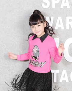 女童玫红色上衣就可以搭配裙装了,玫红色套头卫衣款式内搭一件黑色衬衫,露出衬衫领这样搭配刚刚好,下身搭配黑色流苏半身裙,黑色打底袜的配搭简约又百搭,黑色和玫红色的搭配还